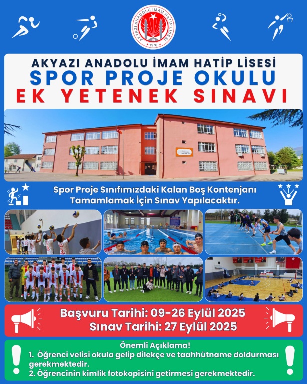 Akyazı Anadolu İmam Hatip Lisesi Spor Proje Okulu Ek Yetemek Sınavı Başvuruları 09-26 Eylül tarihleri arasında yapılacak olup; Ek Yetenek Sınavı 27 Eylül 2025 Cumartesi Günü Yapılacaktır.